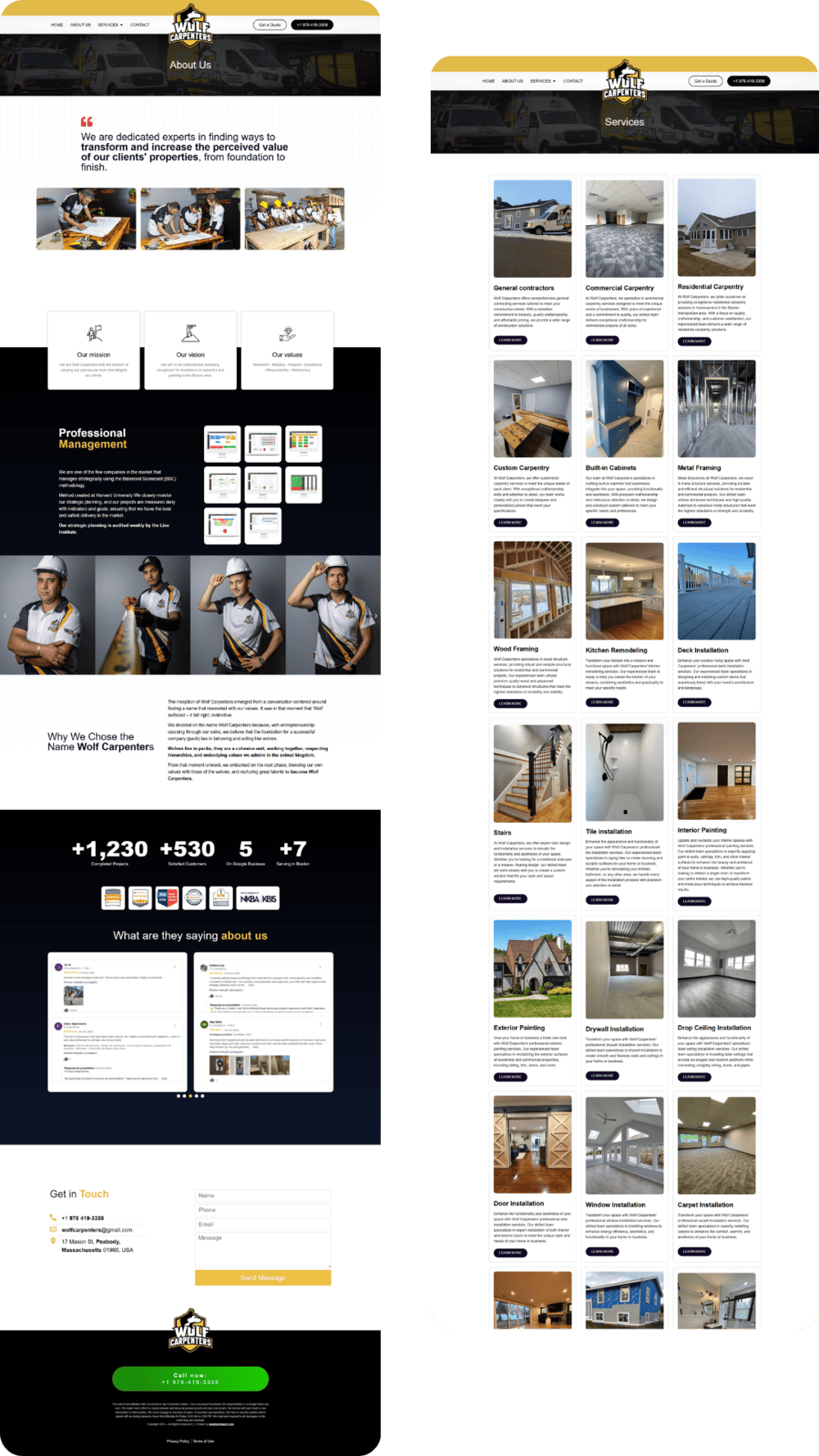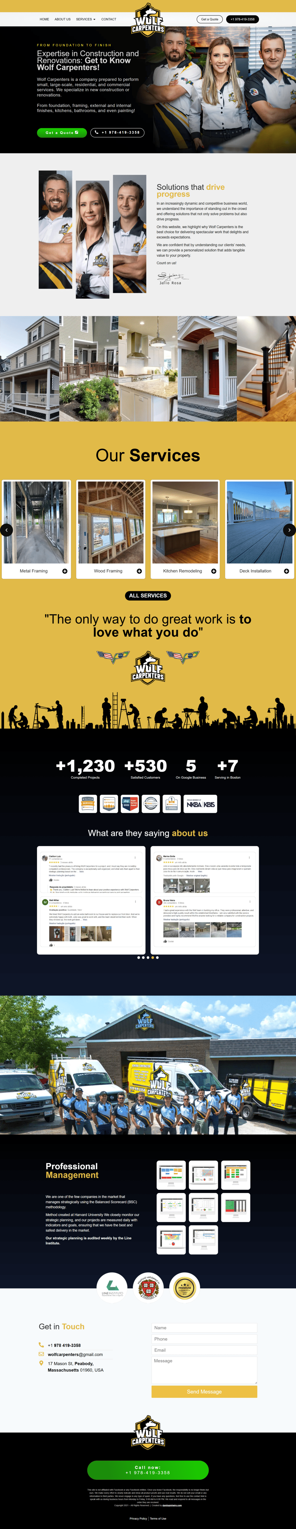 Wolf Carpenters é a equipe que você quer para construir ou reformar sua casa! De pequenas melhorias a grandes projetos, eles estão prontos para transformar seu espaço. O site foi criado para destacar a variedade e a qualidade dos serviços, e facilitar o contato com potenciais clientes nos EUA, onde o telefone e os formulários são o caminho para o sucesso 📞✉️.